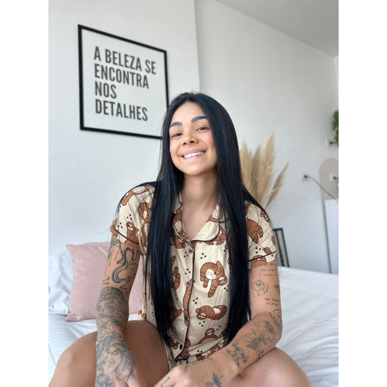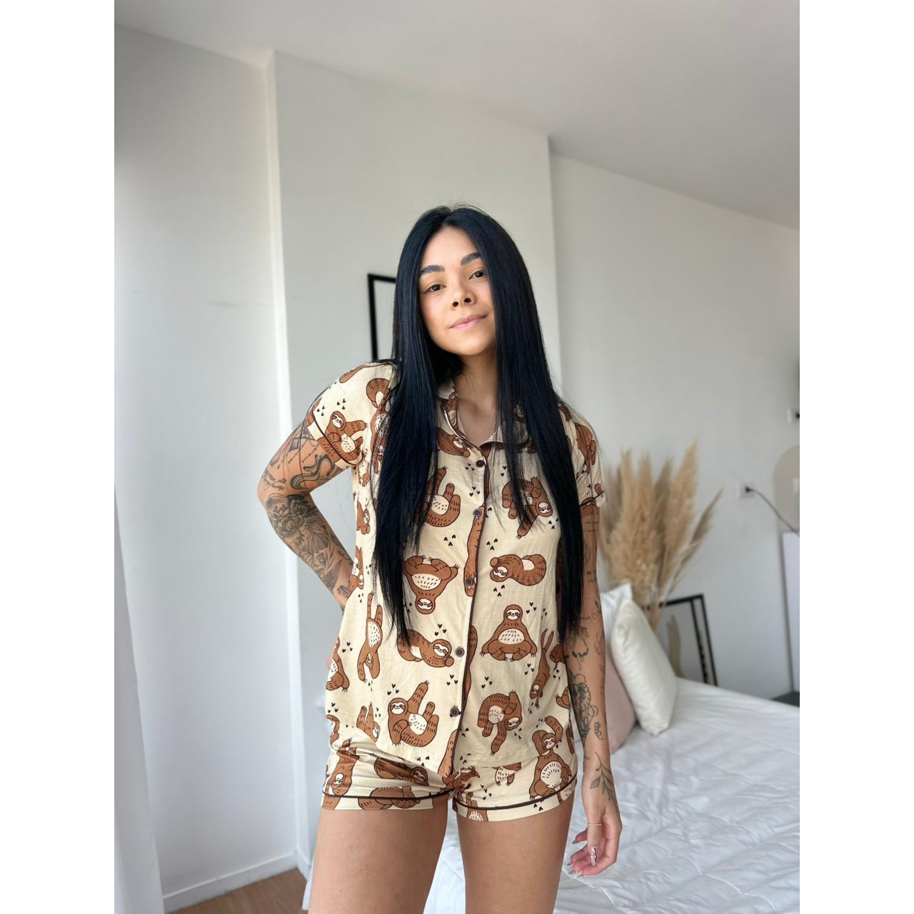 Pijama americano com botões, manga curta e shorts, com estampa de Bicho-preguiça. Confeccionado em viscolycra macia e confortável, perfeito para noites mais leves e cheias de estilo.