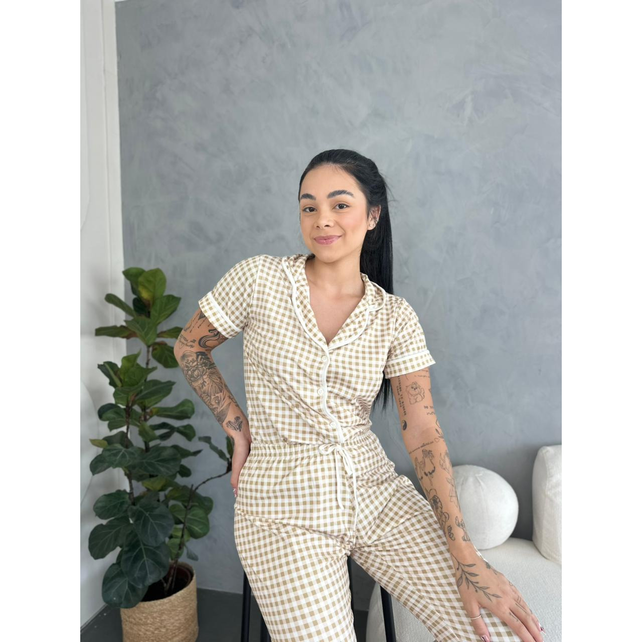 Conjunto americano composto por blusa de manga curta e calça, confeccionado em tecido suede de alta qualidade. O suede é conhecido pelo toque macio e aveludado, proporcionando conforto e uma sensação agradável ao vestir, além de garantir um visual moderno e sofisticado. A blusa de manga curta oferece leveza e praticidade para o dia a dia, enquanto a calça apresenta caimento ajustado que valoriza a silhueta sem abrir mão do conforto. Ideal para quem busca uma peça versátil, elegante e aconchegante para diversas ocasiões.