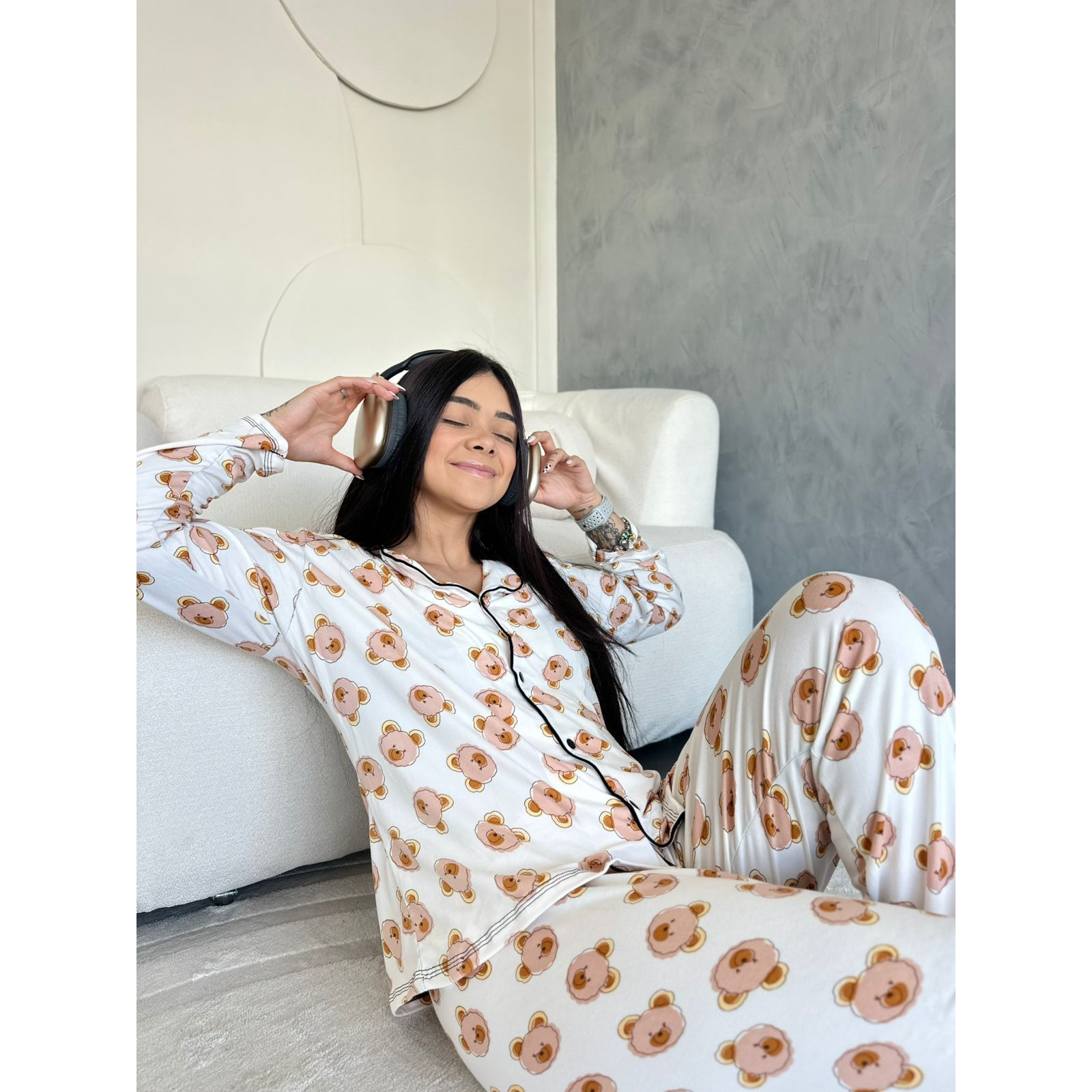 O modelo estilo americano traz um caimento mais estruturado e acabamento diferenciado, enquanto a abertura frontal com botões garante facilidade ao vestir e mais funcionalidade no dia a dia. A estampa de ursinho adiciona delicadeza e um ar divertido à peça, deixando o visual ainda mais encantador.