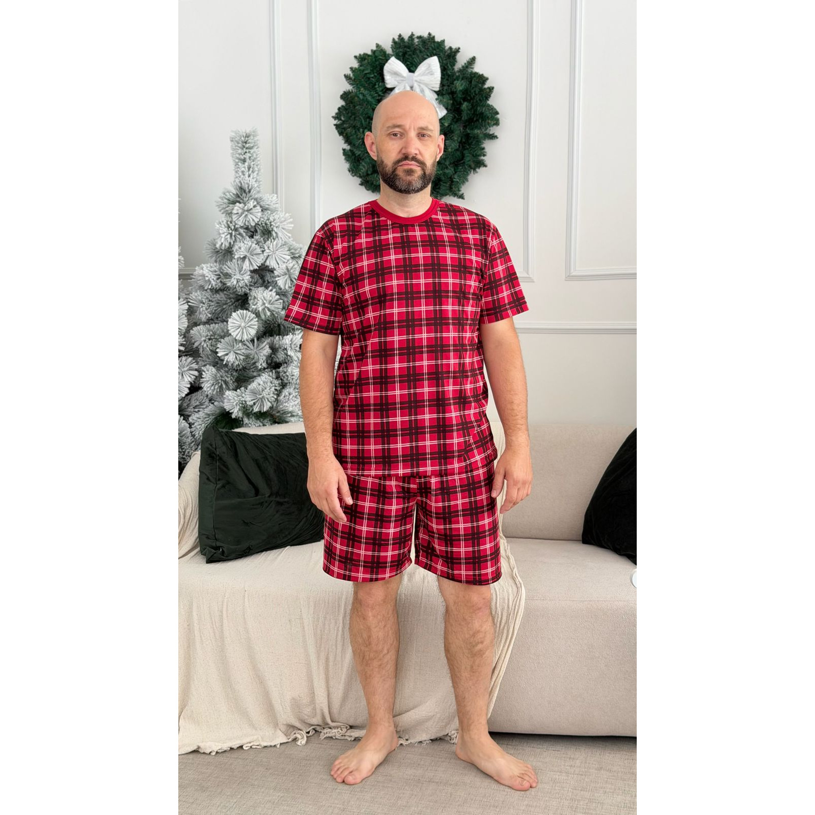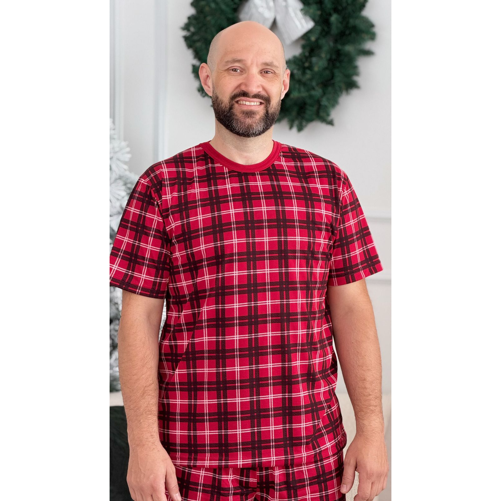 Pijama masculino de Natal com estampa divertida, composto por camiseta de manga curta e shorts. Confeccionado em tecido leve e confortável. O design festivo traz elementos natalinos, tornando o pijama ideal para entrar no clima da temporada.
