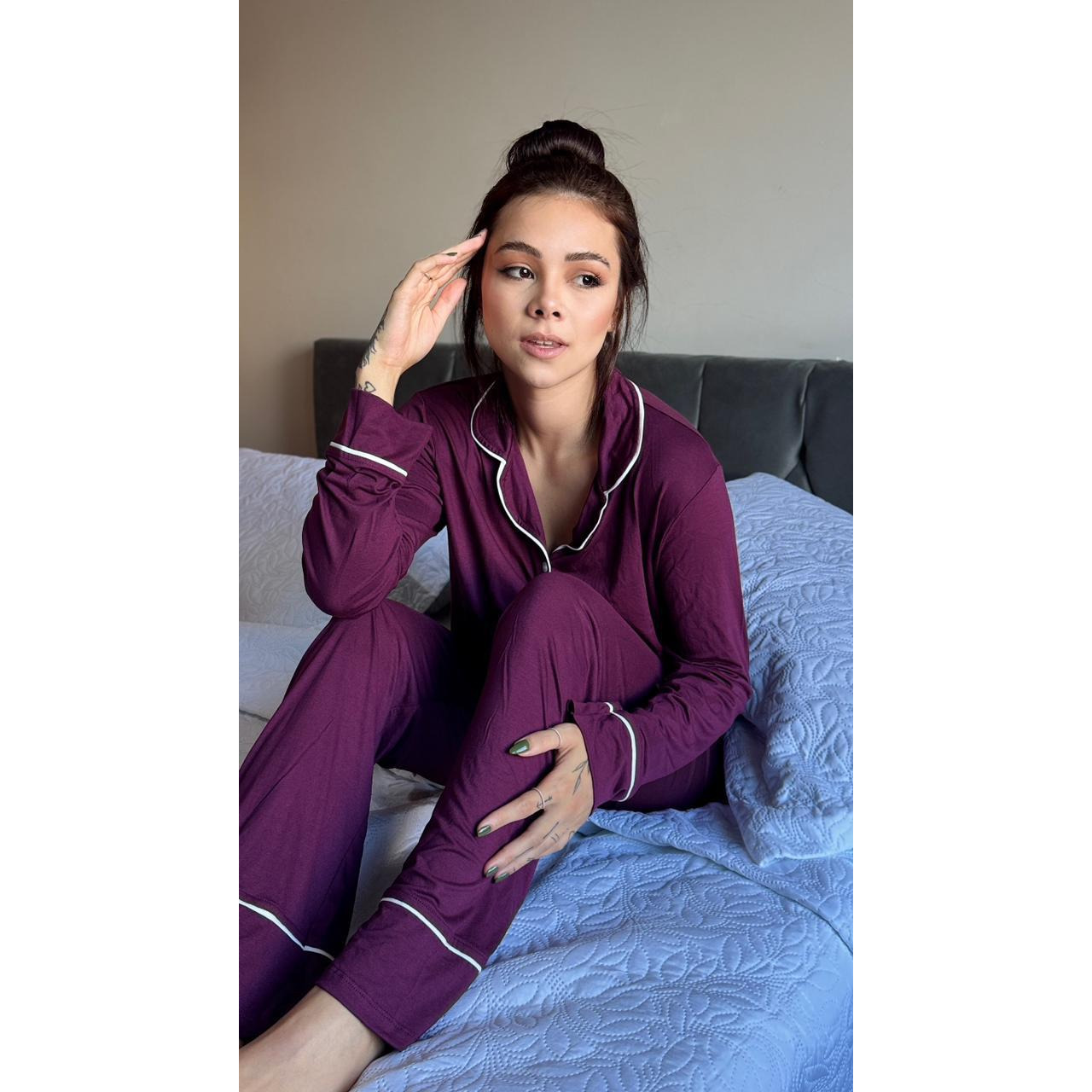 Pijama de viscolycra com botões, aberto, na cor bordô, pensado para oferecer conforto e praticidade em todos os momentos de descanso. Confeccionado em tecido leve, macio e com excelente elasticidade, se ajusta ao corpo sem apertar, proporcionando uma sensação suave na pele.