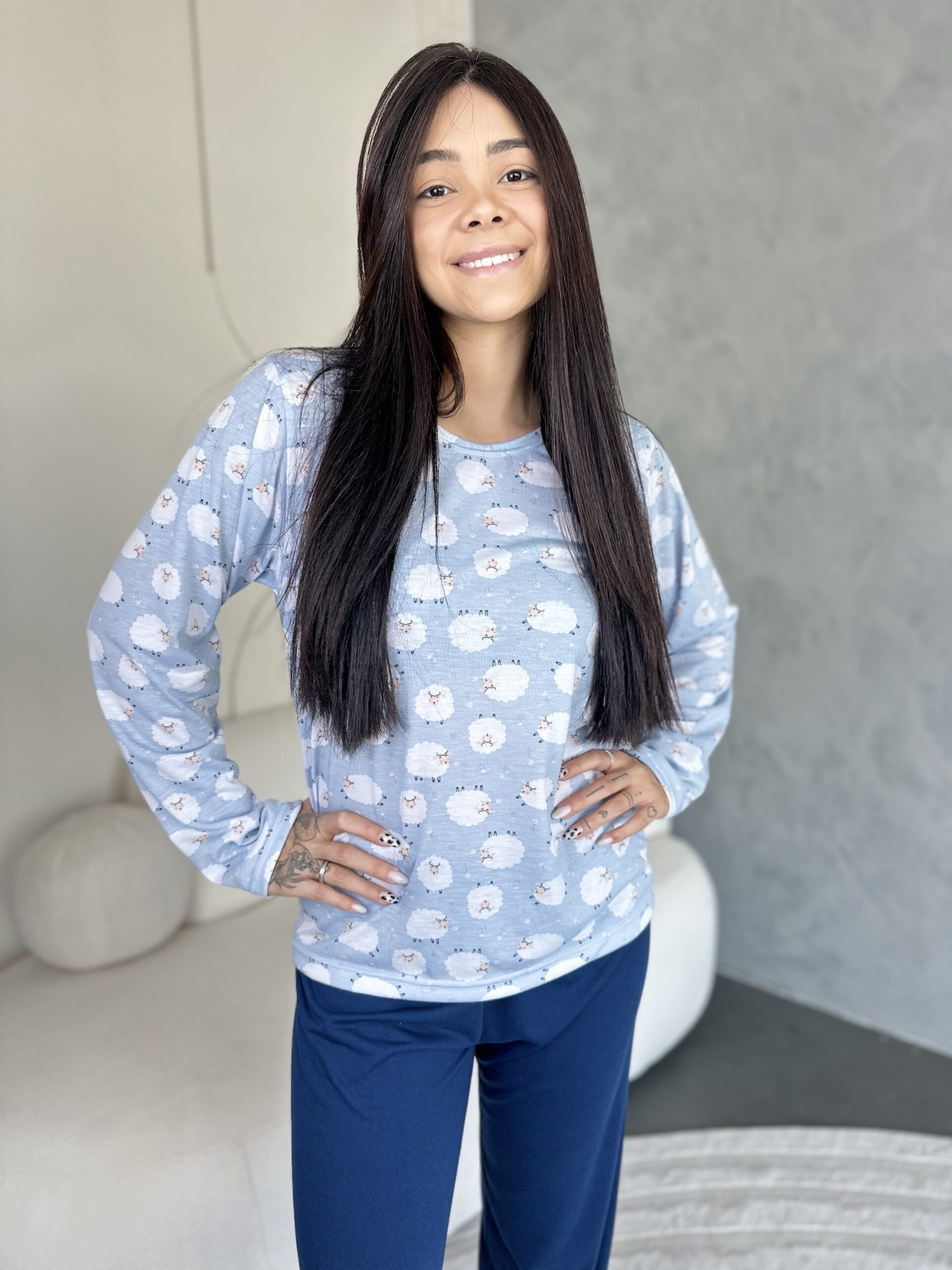Pijama feminino de manga longa com calça, confeccionado em malha macia e confortável, ideal para proporcionar leveza e bem-estar em todas as estações. O modelo possui caimento solto, sem ribana nos punhos e nos pés.